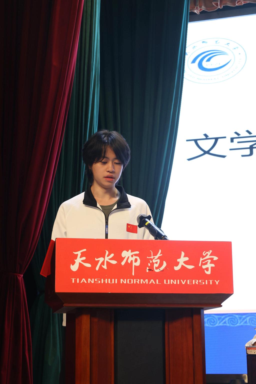 学院院长余粮才教授在讲话中,首先追溯了学院66年的发展历程——从1959年的中文科,到如今拥有国家级特色专业、全国黄大年式教师团队的二级学院,文传始终以“传承文脉、传播新知”为己任。他向新生们介绍了学院的学科优势:汉语言文学专业通过教育部师范专业认证,戏剧影视文学专业屡获省级奖项,中国语言文学更是博士立项建设学位点,为同学们搭建了从本科到硕士、从学习到科研的完整成长平台。 针对新生的大学之路,余院长提出四点殷切希望:一是“博观而约取”夯实学识根基,在广泛涉猎中深耕专业;二是“厚积而薄发”涵养人文情怀,以文字为桥感知人性温度;三是“守正而创新”勇立时代潮头,探索文化传播新路径;四是“知行而合一”书写青春华章,将所学转化为实践力量。他寄语新生:“愿你们以梦为马,在天水师大的画卷上写下浓墨重彩的一笔。”